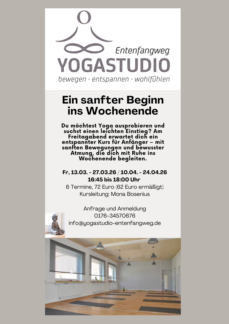 Yogautensilien (Matten, Decken, Stühle, Kissen usw.) sind da, wer mag bringt die eigene Übungsmatte mit.